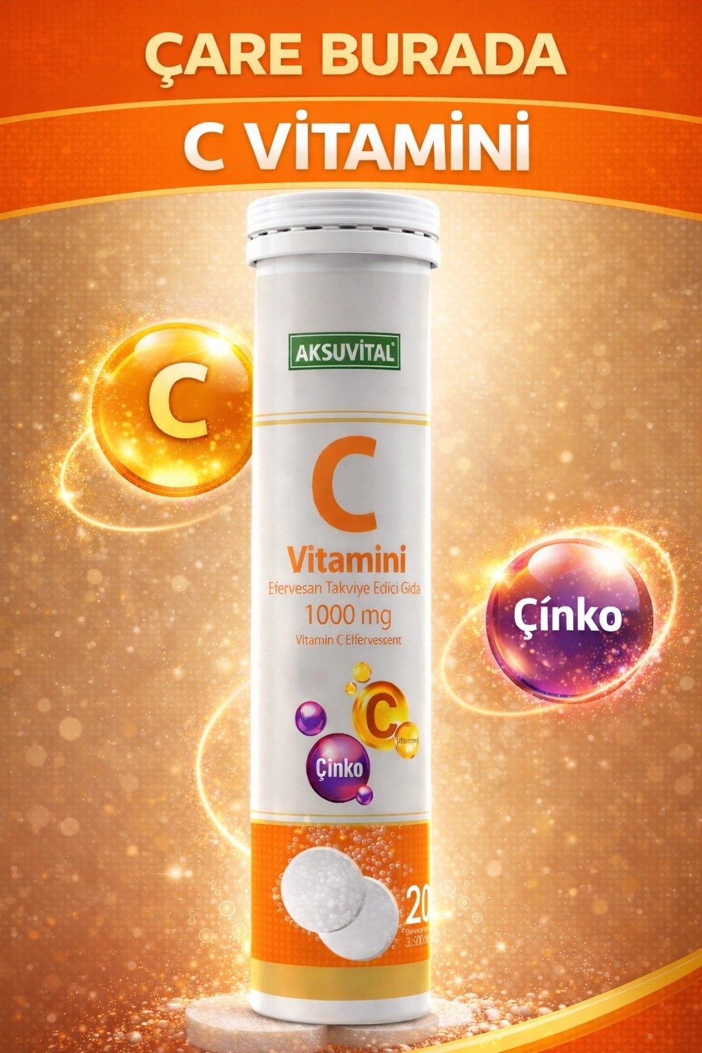 AksuVital C Vitamini, özel formüle edilmiş içeriği ile vücudun ihtiyaç duyduğu enerji ve vitaminlerin karşılanmasına katkıda bulunur. İçerisinde C vitamini, D vitamini ve Çinko bulundurur.