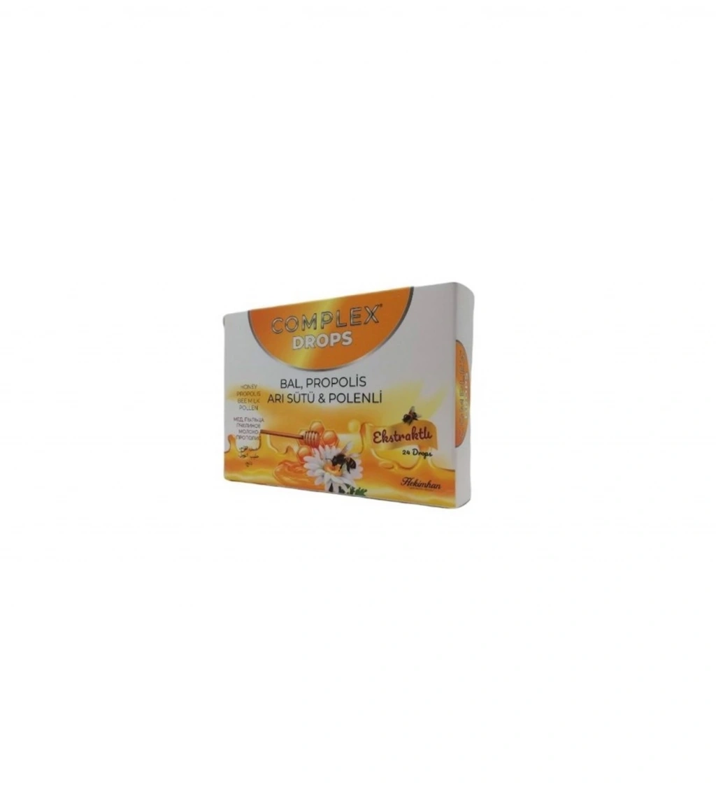 Bal Propolis Arı Sütü Polenli Pastil Complex Drops 24Lü 62 Gr BAL, PROPOLIS, ARI SUTU & POLENLI DROPS Bileşimi: Seker, Maltoz Surubu, Asitlik Duzenleyici (Sitrik Asit), Bal (960,49), Propolls Ekstrakti (%0,30), Arı Sutu Ekstresi (%0, 16), Polen (%0, 16), Mentol, Nane Yagi, Aroma Verici Bal, Renklendiriciler (Beta Karoten, Brown Ht), Kivam Arttirici (Gam Arabik) Ingredients: Sugar, Maltose Syrup, Acidity Regulator (Citric Acid), Honey (%0,49), Propolis Extract (%0,30), Royal Jelly Extract (%0,16), Pollen(%0,16), Menthol, Peppermint Oil, Flavoring Honey, Coloring (Beta Carotene, Brown Ht), Thickening Agent (Gum Arabic)