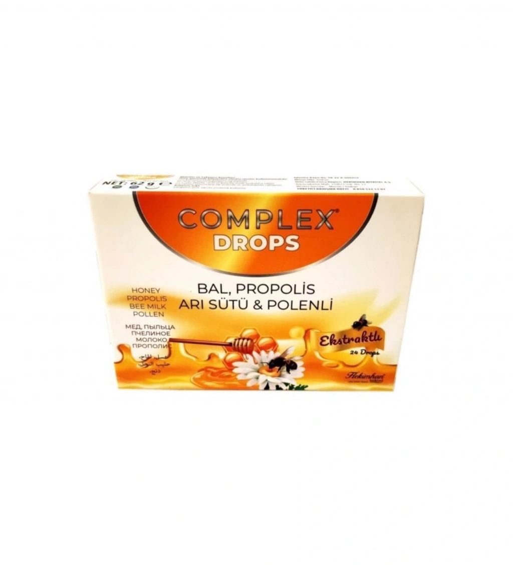 Drops. Bal, Propolis, Arı sütü, Polen içerir. 24 adet drops vardır.