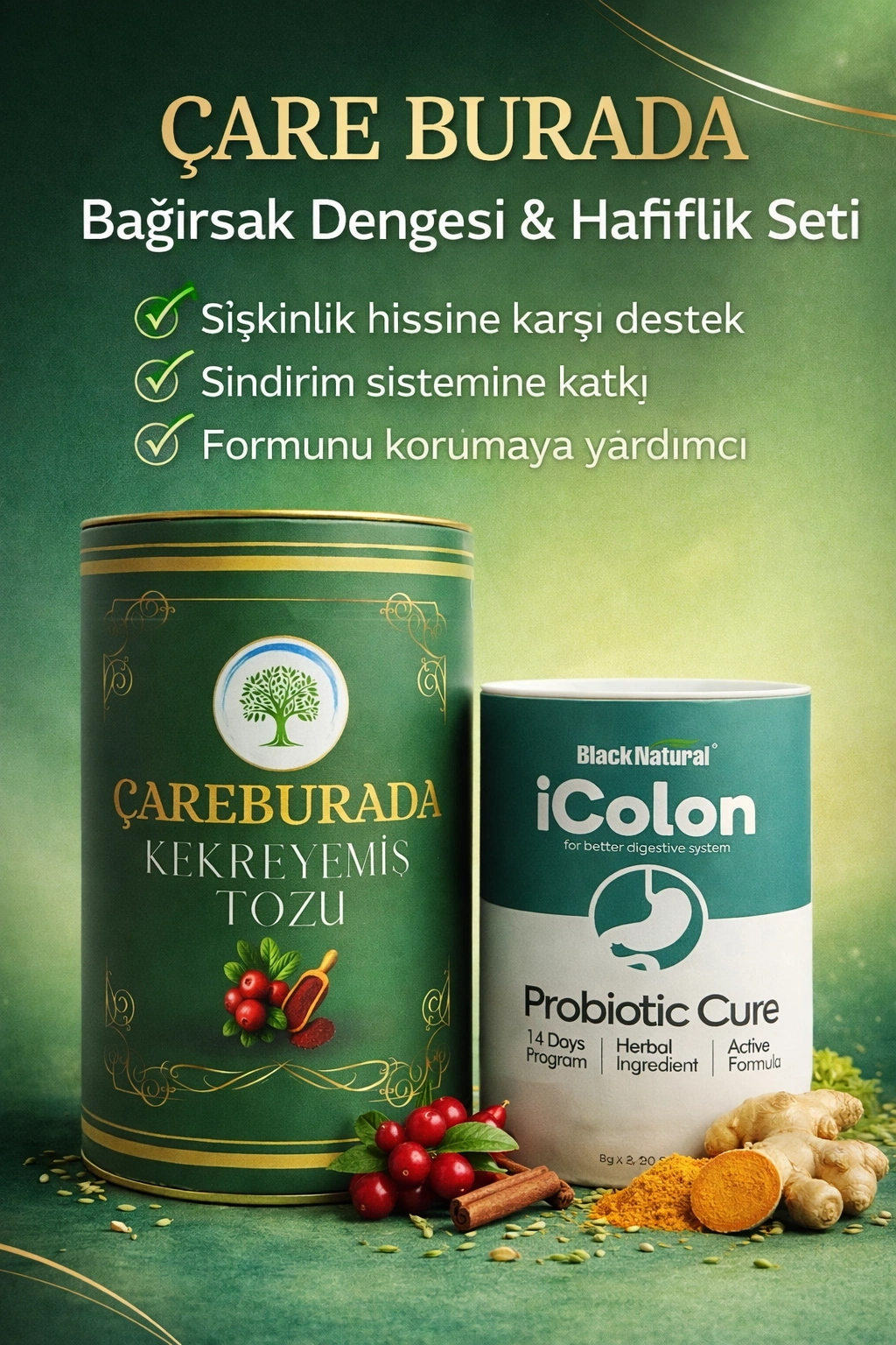 ÇareBurada Bağırsak Dengesi & Hafiflik Seti Kekreyemiş Tozu 8 g x 20 stick + iColon Probiyotik 240 G