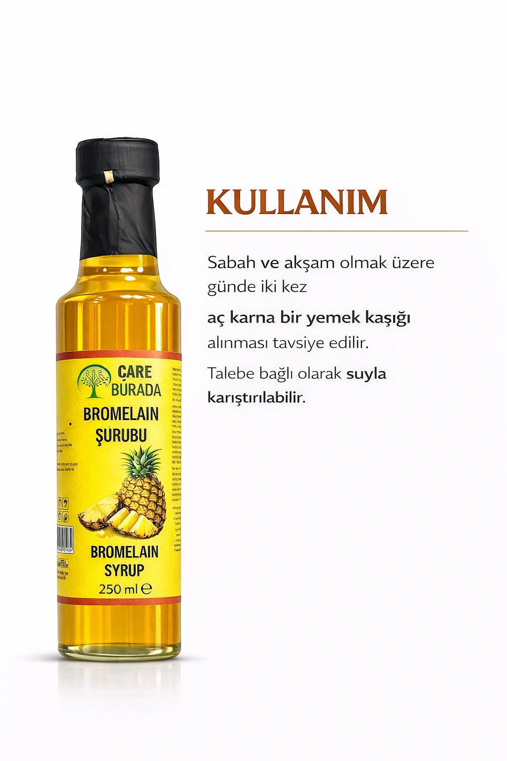 Bromelain şurubu, genellikle günde 2-3 defa, sabah-akşam aç karnına birer yemek kaşığı (yaklaşık 10 ml) tüketilir. Ödem atma ve iltihap giderme için aç karnına, sindirim desteği için ise yemeklerle birlikte kullanımı önerilir. Doğrudan içilebilir veya suya karıştırılarak tüketilebilir.