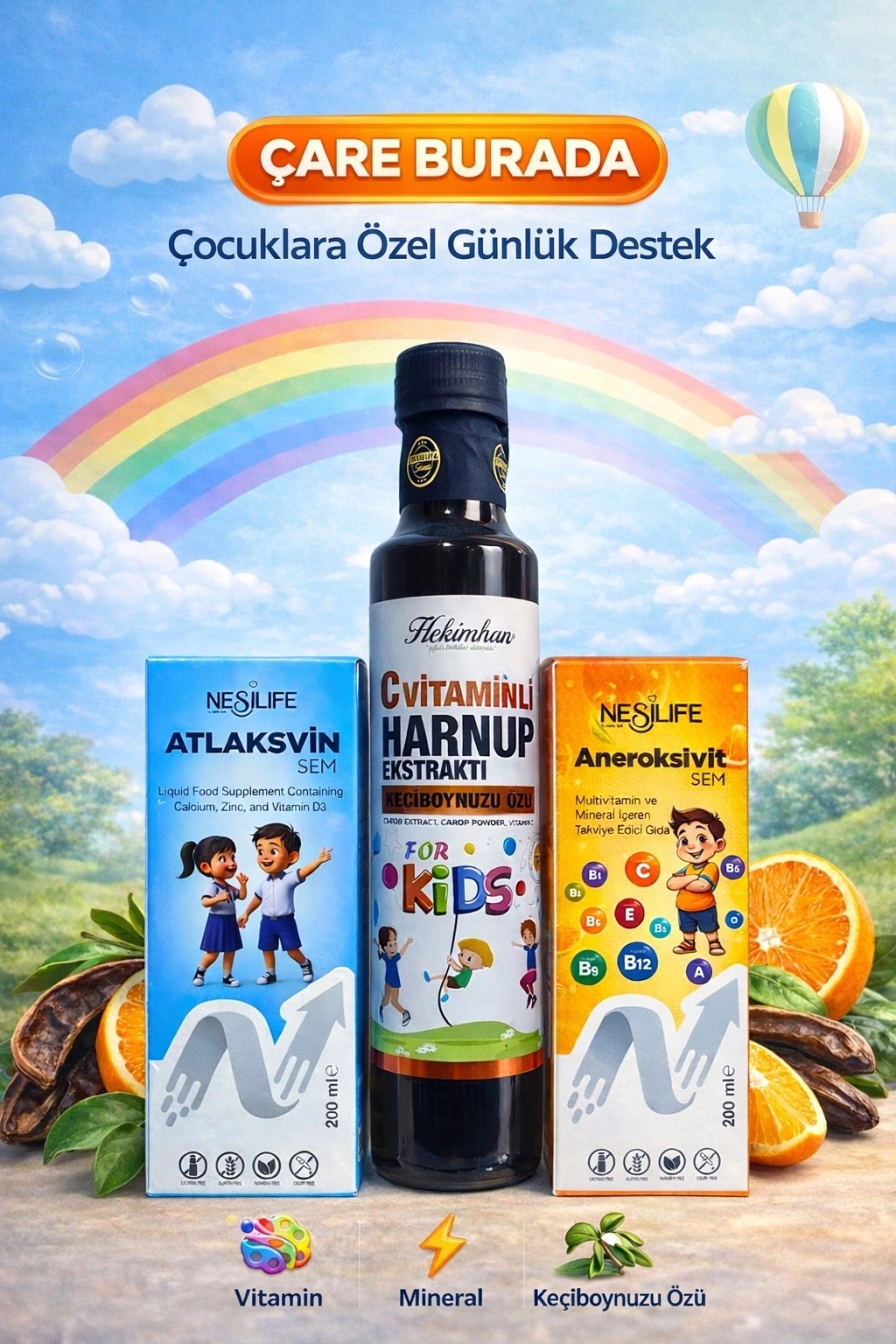 ÇareBurada Çocuklara Özel Günlük Destek Seti | Multivitamin + Kalsiyum D3 + C Vitaminli Harnup Pekmezi