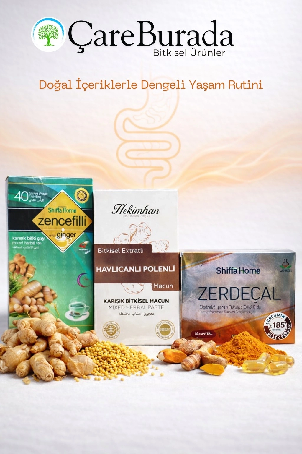 ÇareBurada Günlük Destek Seti & Zencefilli Çay, Havlıcanlı Polenli Karışım & Zerdeçal Kapsül