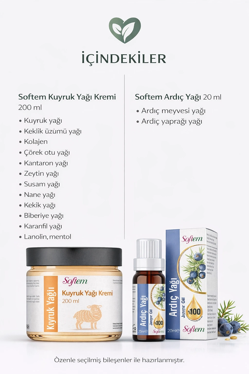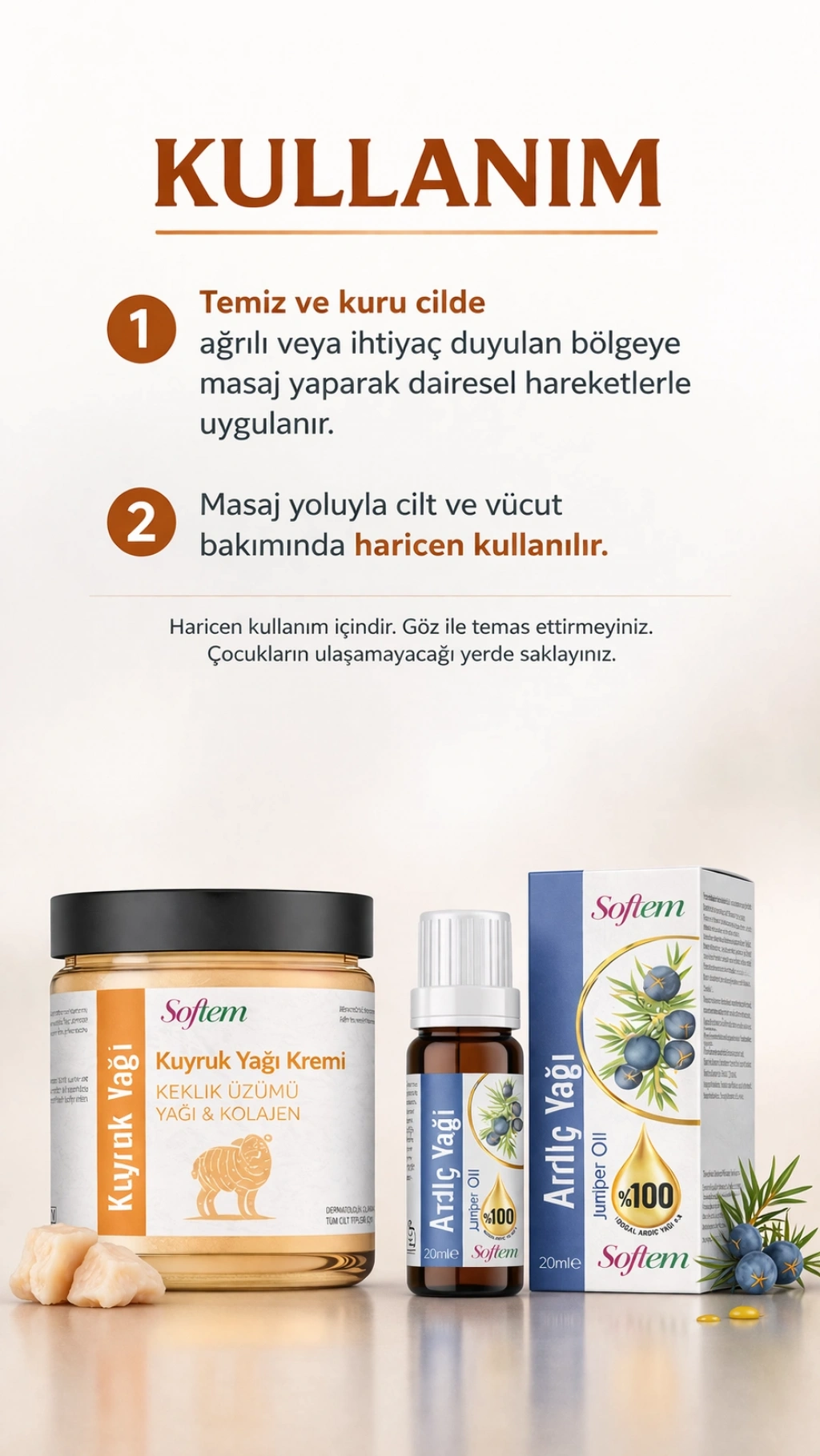 Kuyruk yağı kremi, temizlenmiş, kuru bölgeye günde 1-2 kez dairesel hareketlerle masaj yapılarak uygulanır. Etkisini artırmak için krem sürüldükten sonra bölge sıcak bir bez, tülbent veya streç filmle sarılarak gece boyunca bekletilebilir