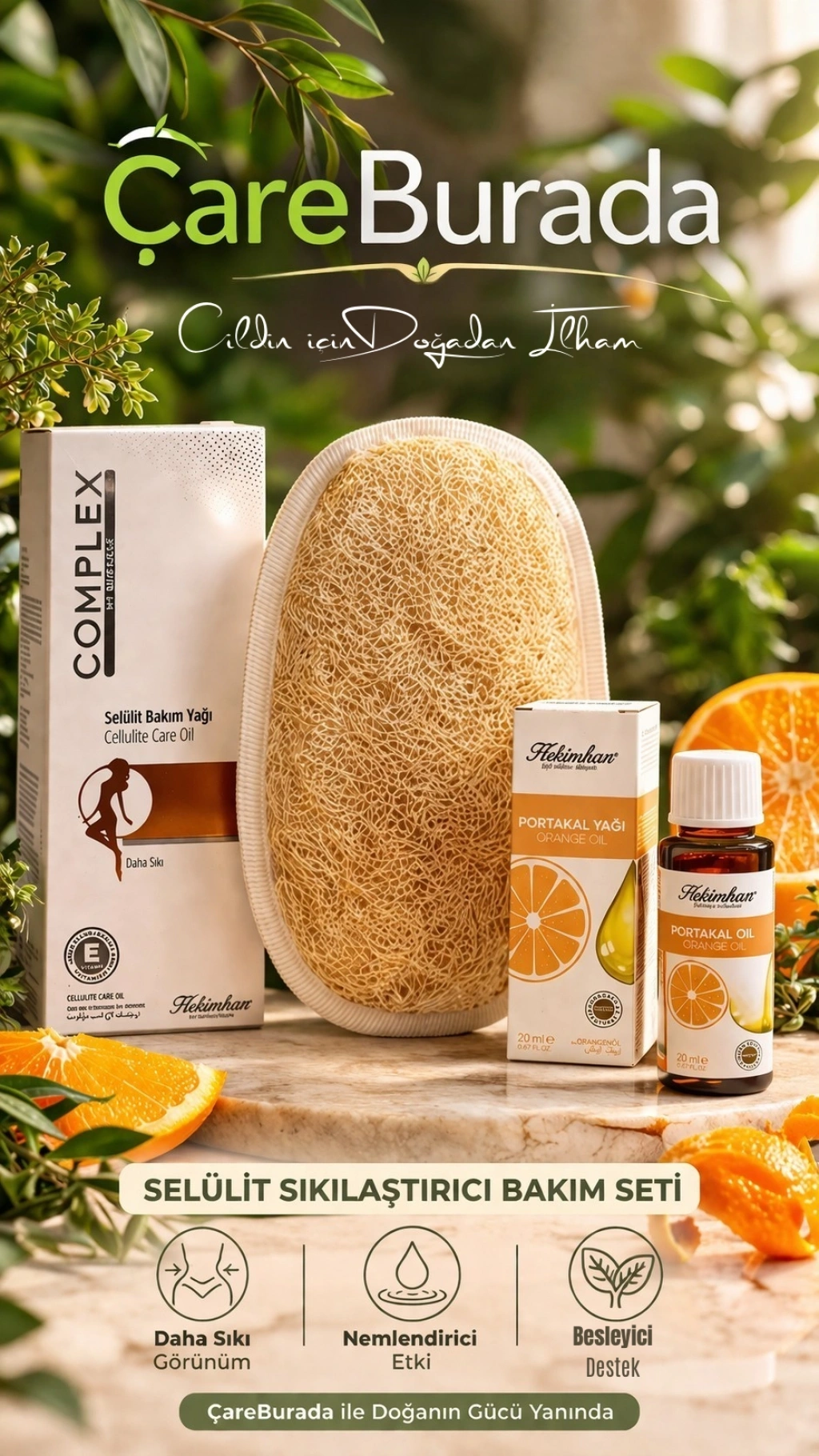 ÇareBurada Selülit Bakım Seti | Portakal Yağı 20 ml. & Selülit Bakım Yağı 125 ml. & Kabak Lifi | Sıkılaştırıcı ve Nem Destekleyici Bakım