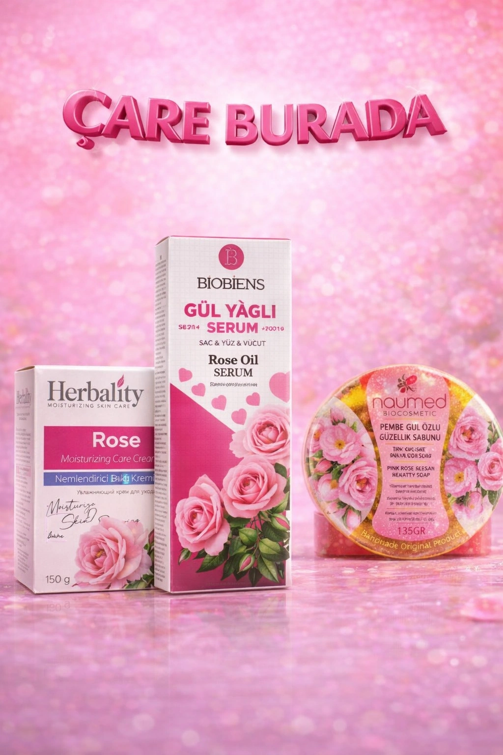 Gül Yağlı Serum 100 Ml (Saç & Vücut & Yüz) + Gül Özlü Nemlendirici Krem 150 g + Gül Özlü Güzellik Sabunu 135 gr