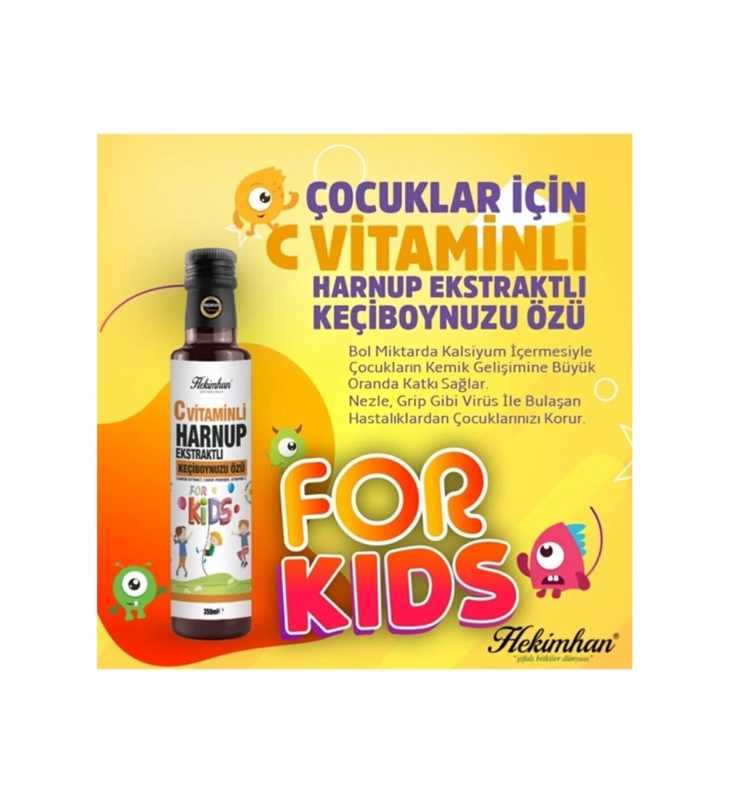 FOR KIDS ( C VİTAMİNLİ HARNUP EKSTRATLI KEÇİBOYNUZU ÖZÜ) 350 ML Çocuklara özel üretilmiştir. Keçiboynuzu özü,keçiboynuzu toz ekstrat,C Vitamini içermektedir.