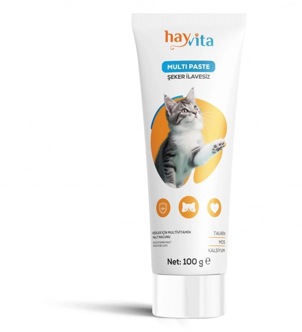 Hayvita Multi Paste Evcil dostlarınızın sağlığına özen gösterirken onlara en iyisini sunun! Hayvita Multi Paste - Şeker İlavesiz, köpeklerden kedilere kadar tüm evcil hayvanlar için özel olarak formüle edilmiş, şeker ilavesiz ve sağlıklı bir vitamin ve mineral desteğidir. ; Başta bağışıklık sistemi olmak üzere, deri tüy sağlığına ve görme fonksiyonunun gelişimine katkıda bulunur. Ayrıca içerisindeki prebiyotik ile sindirim sistemi sağlığının desteklenmesini de sağlamaktadır. ; Kullanım Şekli Yetişkin kedilere günde 4 cm (yaklaşık 2 g) verilmesi önerilir. İhtiyaca bağlı olarak günlük verilen miktar 2 katına kadar çıkarılabilir. Tüpten sıkarak, mamasına katarak veya patisine sürerek kullanılabilir. ; Muhafaza koşulları Oda sıcaklığında (25°C), ağzı kapalı ve güneş ışığına maruz kalmadan saklayınız. ; Uyarılar Sadece kedilerin kullanımı içindir. Çocukların ve hayvanların ulaşamayacağı şekilde muhafaza ediniz. Son kullanım tarihi, Parti No ambalaj/tüpün üzerindedir. İaç değildir, kediler için tamamlayıcı yemdir. Tedavi için kullanılmaz. Net: 100 g e ;