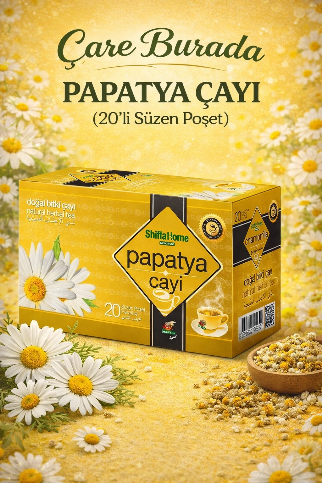 Papatyanın toprak üstü çiçeklerinden özenle toplanarak üretilen Shiffa Home papatya çayı, içeriğinde nikotinik asit, salisilik asit, karoten, C vitamini, palmitinik, stearinik ve linoleik asit glikozitleri gibi önemli etken maddeler bulundurmaktadır.