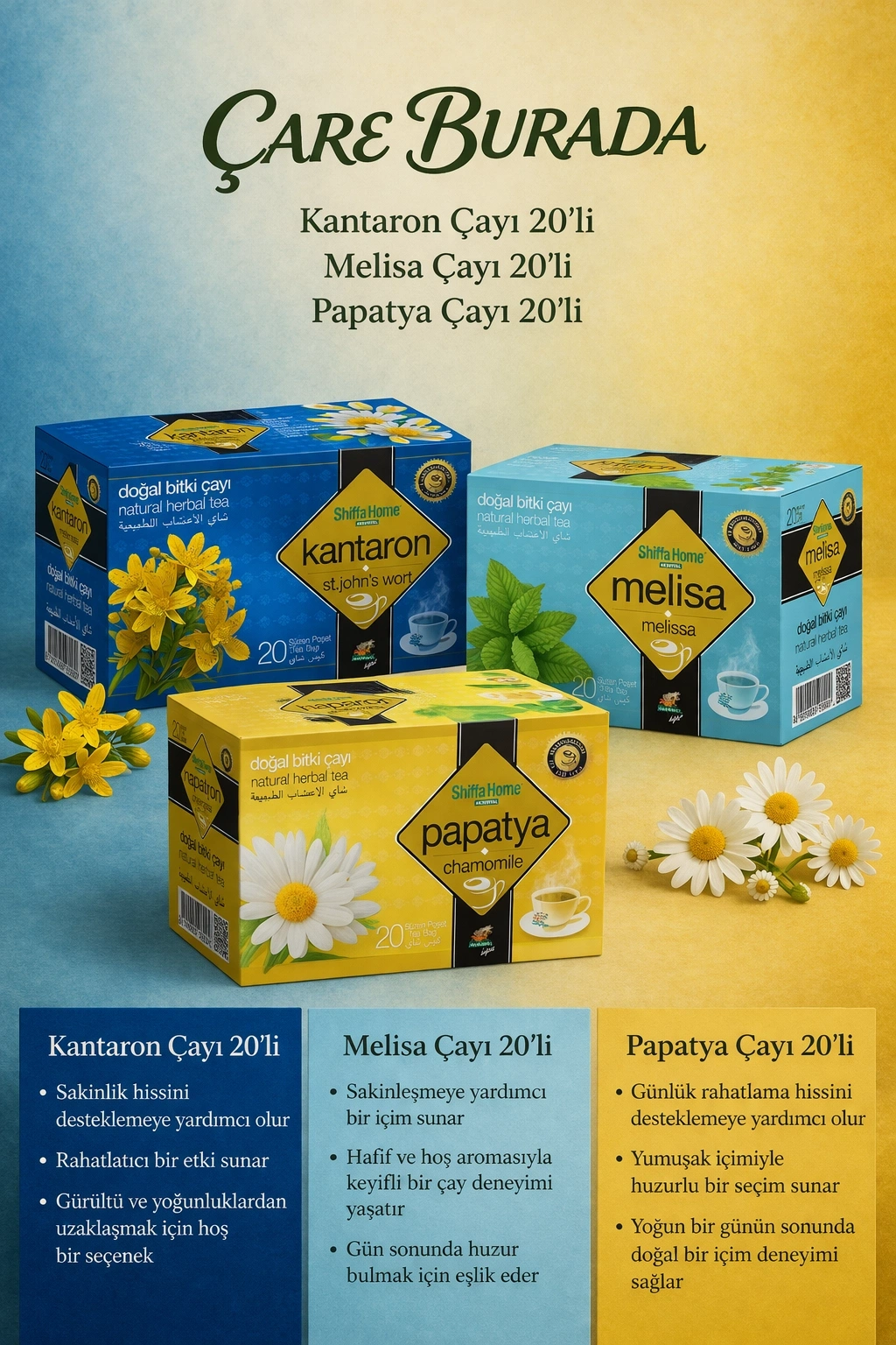 Rahat Uyku ve Anti-Stres Çay Seti (Melisa Çayı 20'li & Kantaron Çayı 20'li & Papatya Çayı 20'li)