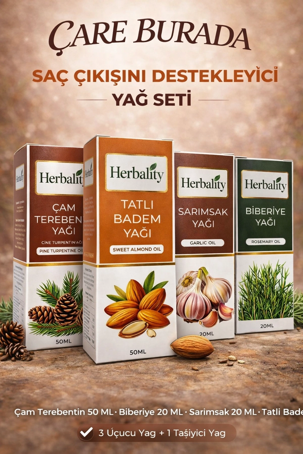 Saç Çıkışını Destekleyici Yağ Seti (Sarımsak Yağı & Biberiye Yağı & Çam Terebentin Yağı & Tatlı Badem Yağı)