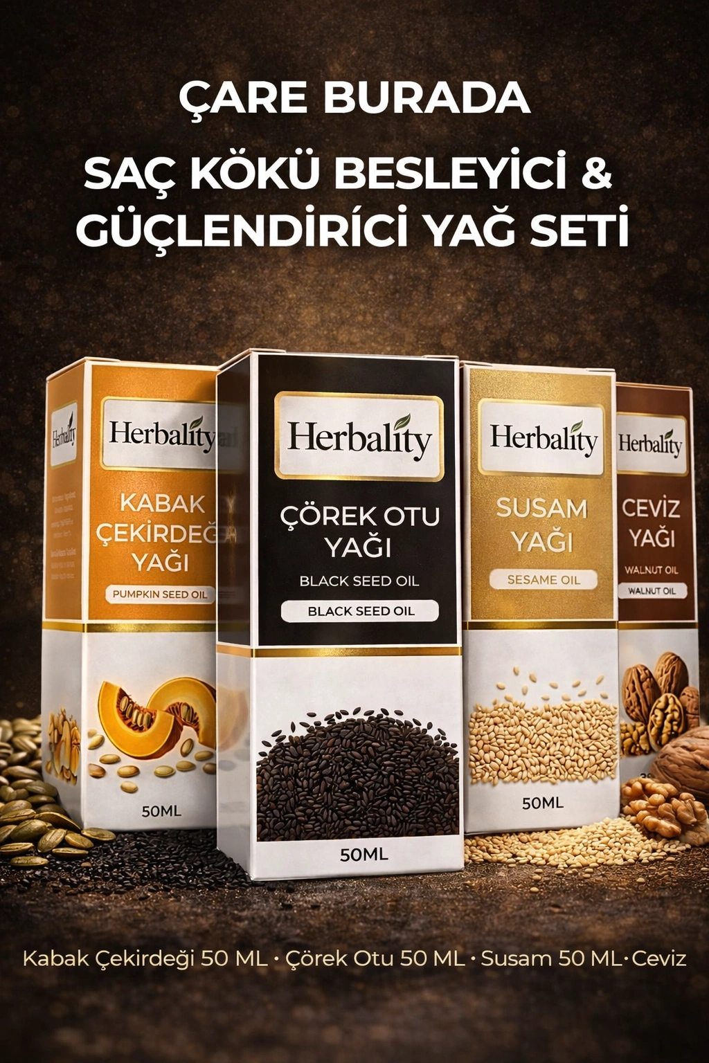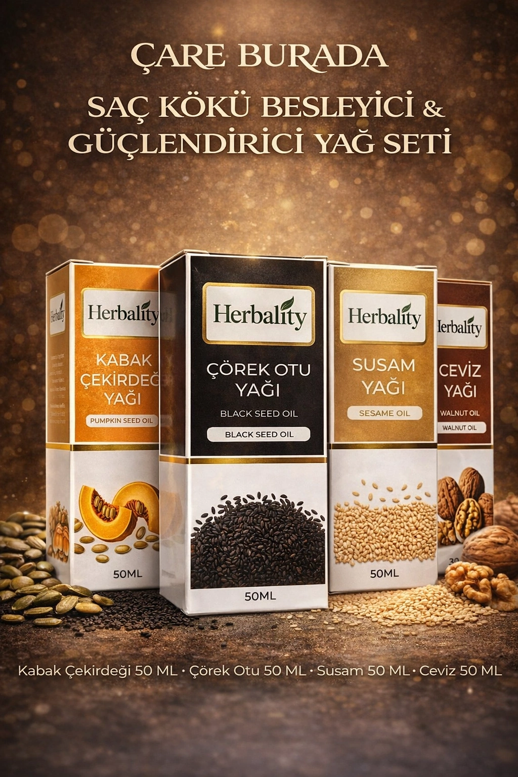 Saç Kökü Besleyici ve Güçlendirici Yağ Seti (Kabak Çekirdeği Yağı & Susam Yağı & Çörek Otu Yağı & Ceviz Yağı)
