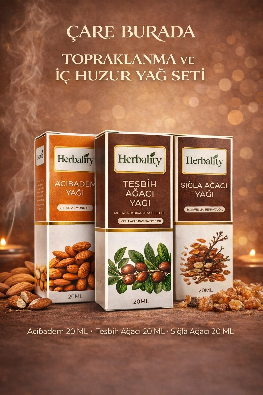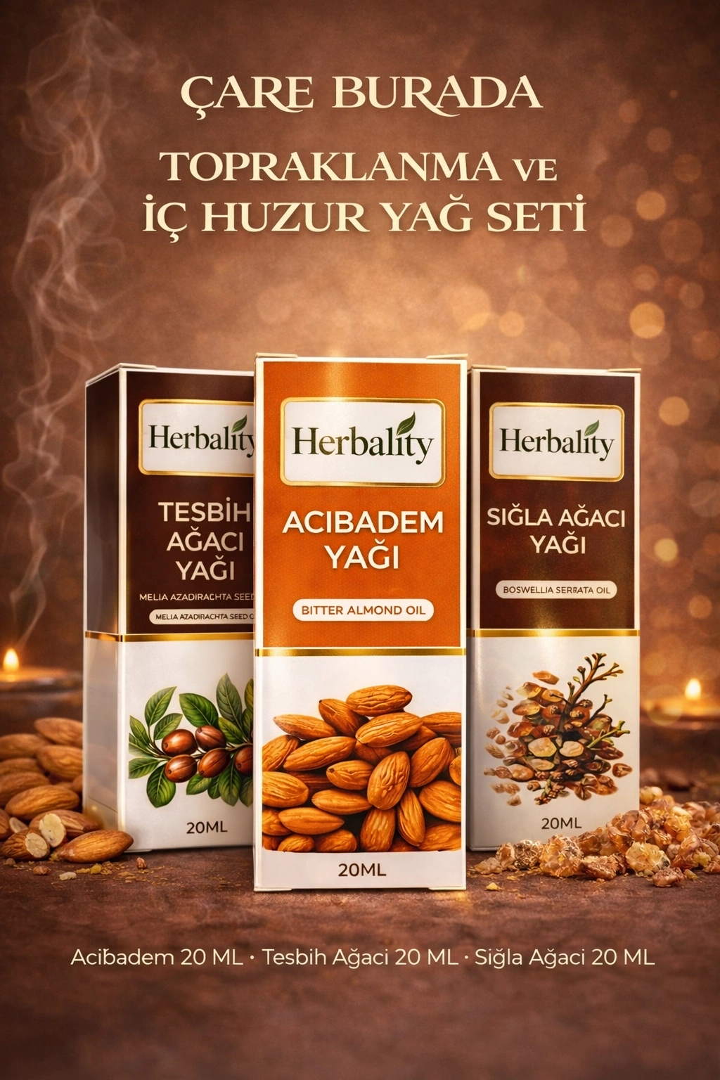 Topraklanma ve İç Huzur Yağ Seti (Acıbadem Yağı & Sığla Ağacı Yağı & Tesbih Ağacı Yağı)