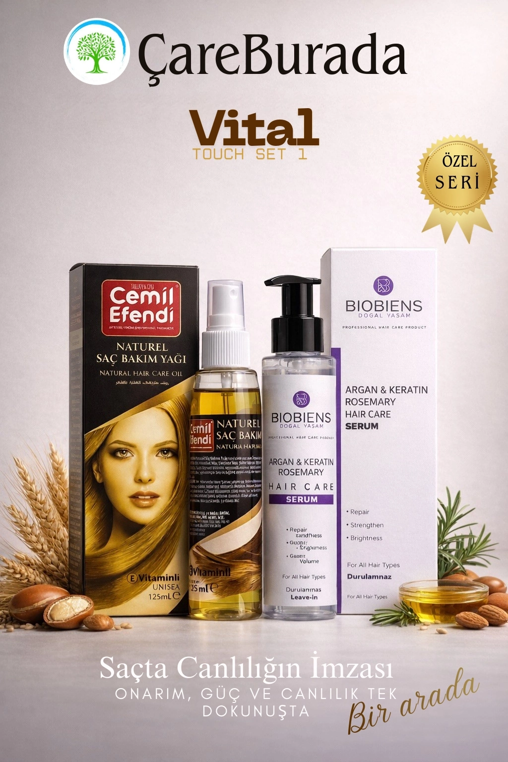 Vital Touch Set 1 - Cemil Efendi Naturel Saç Bakım Yağı 125 ml + Biobiens Argan & Keratin Saç Bakım Sütü
